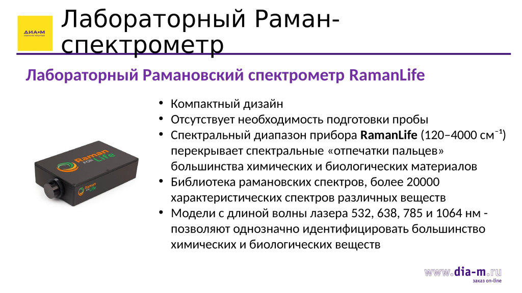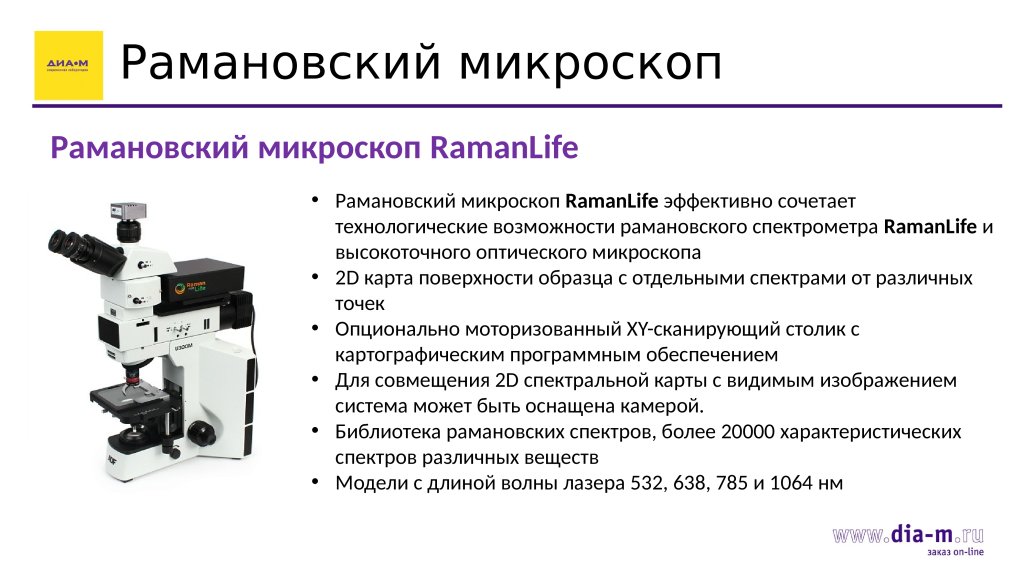 Также в ассортименте «Диаэм» есть рамановский микроскоп RamanLife, эффективно сочетающих технологические возможности рамановского спектрометра RamanLife и высокоточного оптического микроскопа.