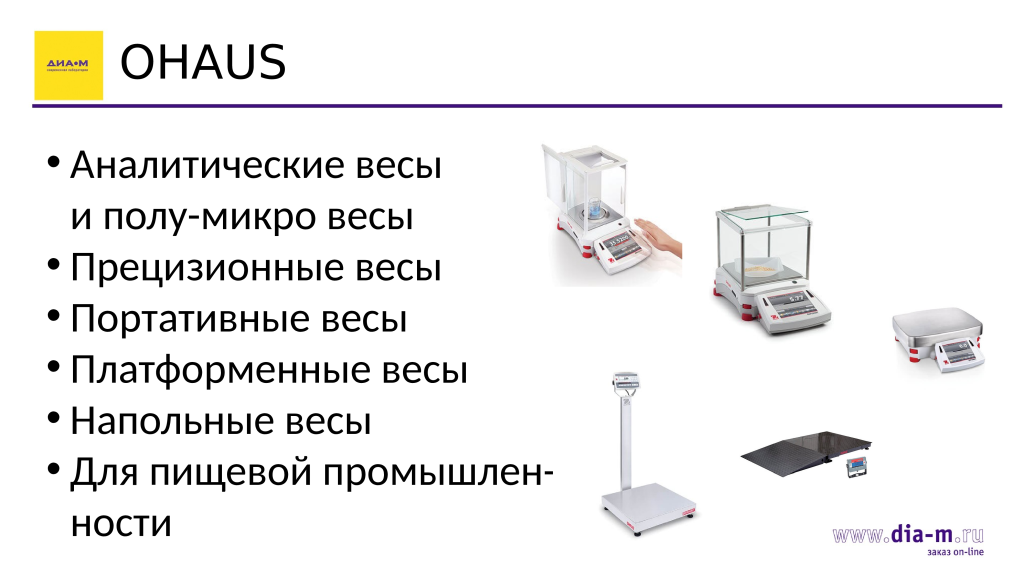 Тем не менее заводы Ohaus были и остались в Китае, и у «Диаэм» есть возможность возить почти полный спектр всего, что Ohaus производит на данный момент: весы (аналитические и полумикровесы, прецизионные, портативные, платформенные, для пищевой промышленности), электрохимию, другую продукцию, в данном случае в ассортименте практически ничего не изменилось.