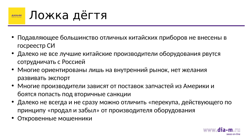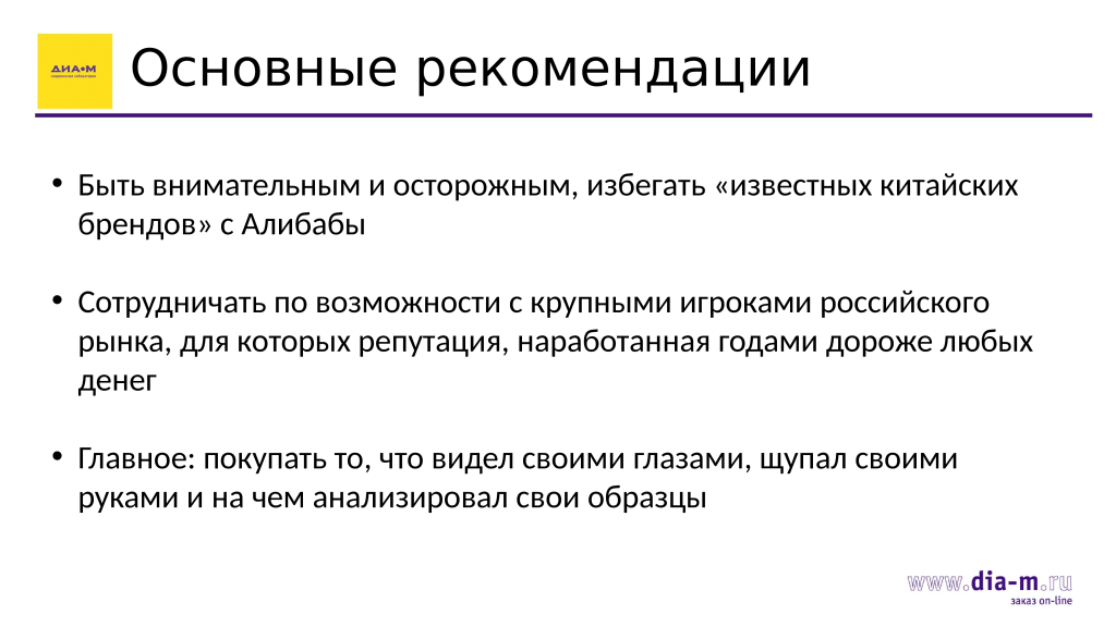 По возможности сотрудничать с крупными игроками российского рынка, потому что для крупных компаний, работающих много лет (например, «Диаэм» на момент мультиконференции находилась на рынке уже 34 года), репутация намного дороже денег. Никто не застрахован от ошибок, но компании, дорожащие своей репутацией, скорее пойдут на финансовые убытки и постараются найти решение в пользу клиента: заменить прибор, вернуть деньги, одним словом — полностью идут навстречу клиенту.