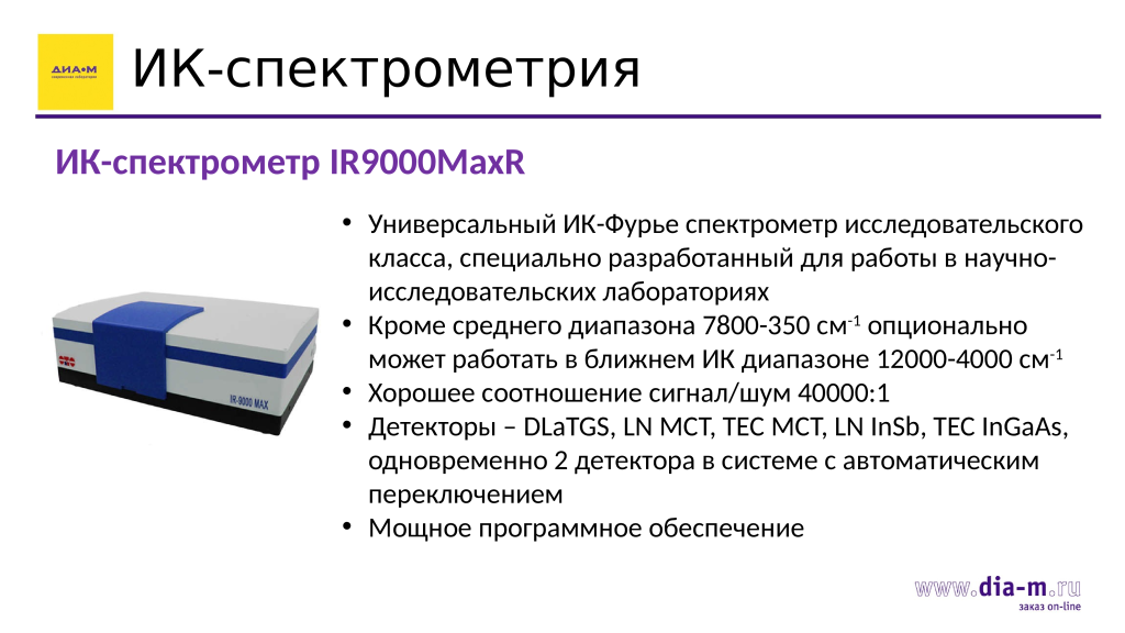 Также «Диаэм» поставляет китайский универсальный ИК Фурье-спектрометр исследовательского класса IR9000MaxR, специально разработанный для научно-исследовательских лабораторий. Его особенность, в отличие от предыдущего, состоит в том, что он может опционально расширяться из среднего (7800–350 см-1) в ближний ИК диапазон (12000–4000 см-1). На нем могут стоять два детектора одновременно (выбор среди DLaTGS, LN MCT, TEC MCT, LN InSb, TEC InGaAs) и два источника. Если кому-то нужна ближняя область ИК для исследований, это отличный прибор. Добавим, что прибор характеризуется хорошим соотношением сигнал/шум на уровне 40000:1 и тоже снабжен мощным программным обеспечением.