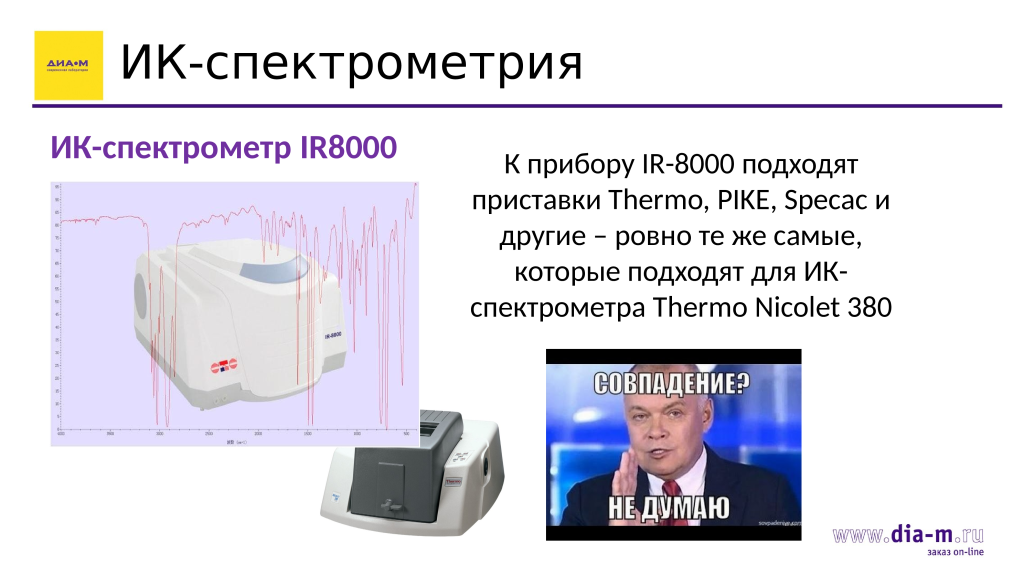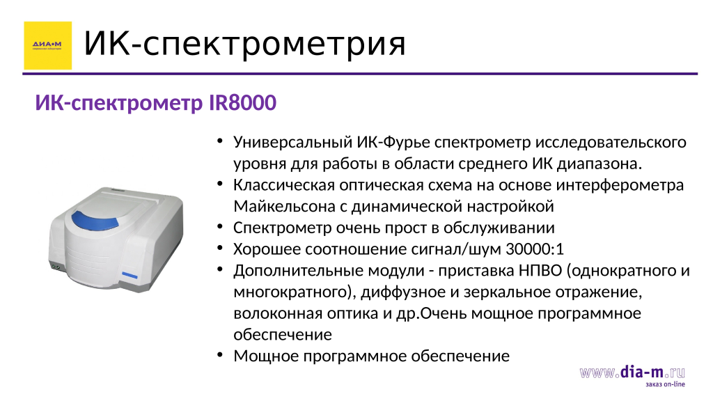 В плане ИК спектрометрии «Диаэм» предлагает замечательный ИК Фурье-спектрометр IR8000 — по большому счету это полная копия Nicolet 380 от Thermo FS. У него вся та же оптика, такое же кюветное отделение, только внешне он чуть-чуть переработан. И это очень хорошо, потому что Nicolet 380 был одним из лучших приборов от Thermo Fisher Scientific. Он работает отлично, а свои задачи в среднем ИК диапазоне выполняет просто на «5+».