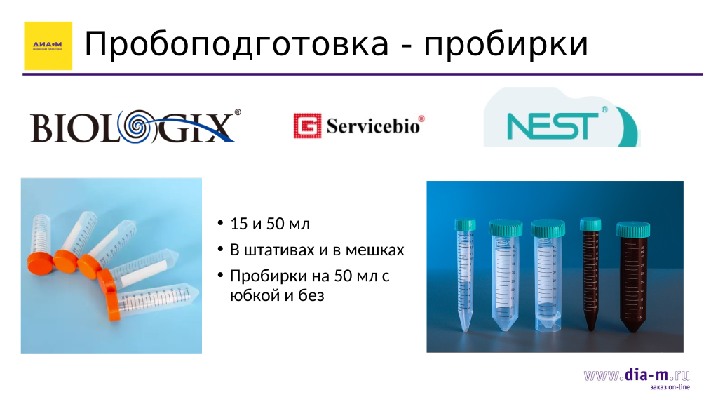 К приборам, используемым для пробоподготовки, необходимы пластик: виалы, пробирки и другие емкости. Широкий ассортимент такой продукции «Диаэм» поставляет, стараясь предложить продукцию как китайских брендов Biologix, Servicebio, Nest, так и — по запросу — можно будет рассмотреть возможность поставки какого-то конкретного пластика из Европы, к которому привык конкретный пользователь. На складе «Диаэм» много пластика, нередки новые поступления, а потому срок поставки, как правильно, сокращен до минимума.