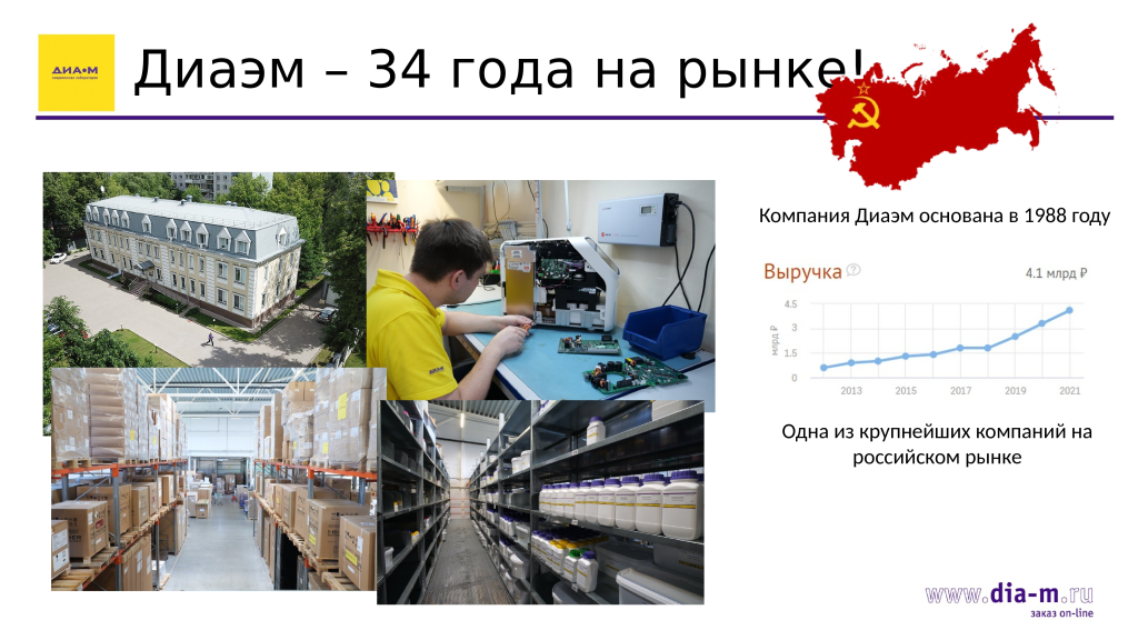 Что касается компании «Диаэм», она относится как раз к тем, для кого репутация выше любых финансовых потерь, и 34 года на рынке это доказывают. У компании есть свой сервис, который полностью осуществляет гарантийное и постгарантийное обслуживание, а также ремонт всего поставляемого оборудования. Компания отличается тем, что поддерживает значительные складские запасы по многим позициям. На слайде — офис «Диаэм» в Москве на Магаданской улице, а также реальные фото склада компании в Мытищах.