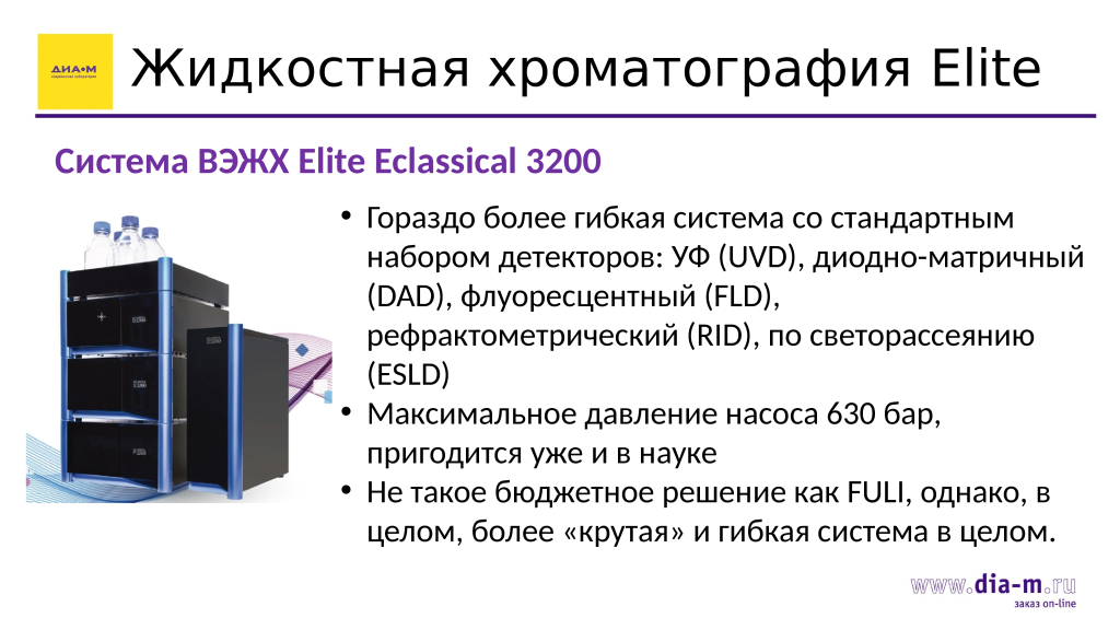Система ВЭЖХ Elite Eclassical 3200 – это более продвинутая исследовательская модель, более гибкая и снабженная стандартным набором детекторов: УФ (UVD), диодно-матричным (DAD), флуоресцентным (FLD), рефрактометрическим (RID) и по светорассеянию (ESLD). Насос у нее более мощный (до 630 бар), что пригодится и в научных целях.