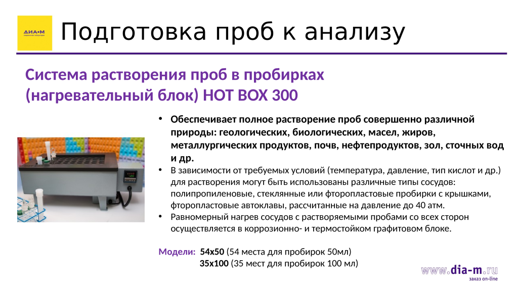 Системы HOT BOX 300 обеспечивают полное растворение проб совершенно различной природы: геологических, биологических, масел, жиров, металлургических продуктов, почв, нефтепродуктов, зол, сточных вод и др.