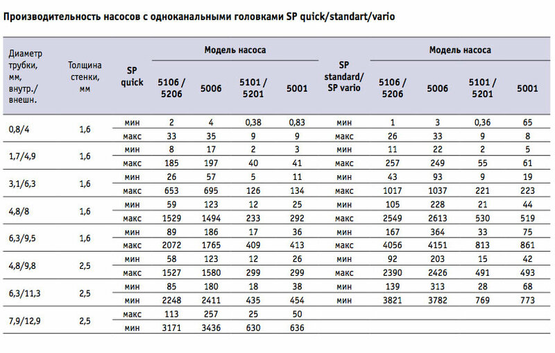 • производительность от 0,4 до 3300 мл/мин, зависит от насоса и шланга.