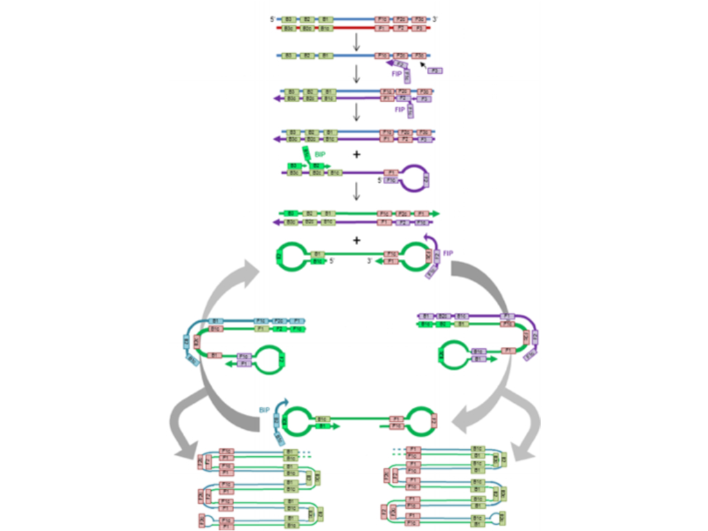 В отличие от классической полимеразной цепной реакции LAMP не требует термоциклирования, амплификация ДНК или РНК происходит при постоянной температуре, около 65 °C. ДНК-полимераза обладающая сильной вытесняющей активностью 5’- 3’, инициирует синтез, и 2 специально сконструированных праймера образуют «петлевые» структуры для облегчения последующих циклов амплификации. Это очень быстрый, высокочувствительный и высокоспецифичный способ амплификации нуклеиновых кислот.