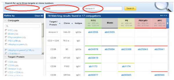 Просто введите в соответствующие графы названия белков-мишеней и нажмите «Поиск». Данный конфигуратор многоцветной цитометрии позволяет отбирать и сравнивать конъюгаты против нескольких мишеней, тем самым делая поиск оптимального сочетания максимально простым. Узнать больше >>> |