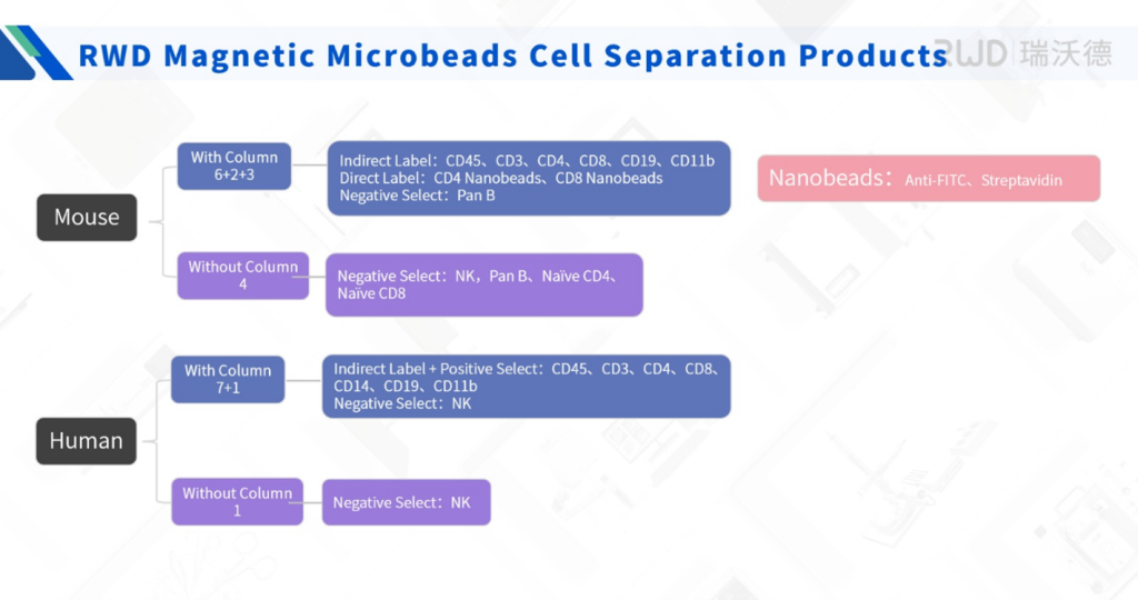 Продукты для разделения клеток RWD включают в себя наборы для разделения клеток с магнитными микрошариками и колонки для разделения клеток, которые позволяют проводить сепарацию с высокой чистотой и высокой жизнеспособностью за счет простой работы. Наноразмерные магнитные шарики не требуют элюции, а разделенные клетки можно напрямую использовать в последующих экспериментах, таких как проточная цитометрия, культивирование клеток, секвенирование отдельных клеток и т.д. Преимущества набора для магнитной сепарации RWD